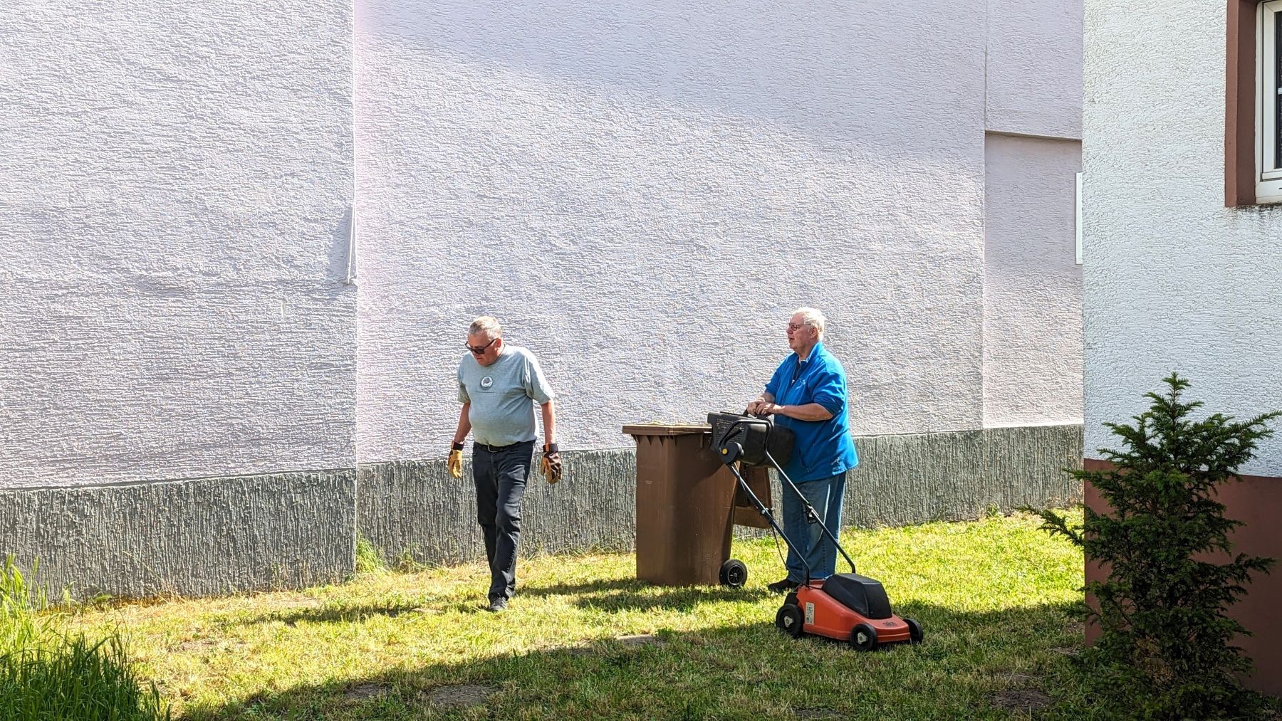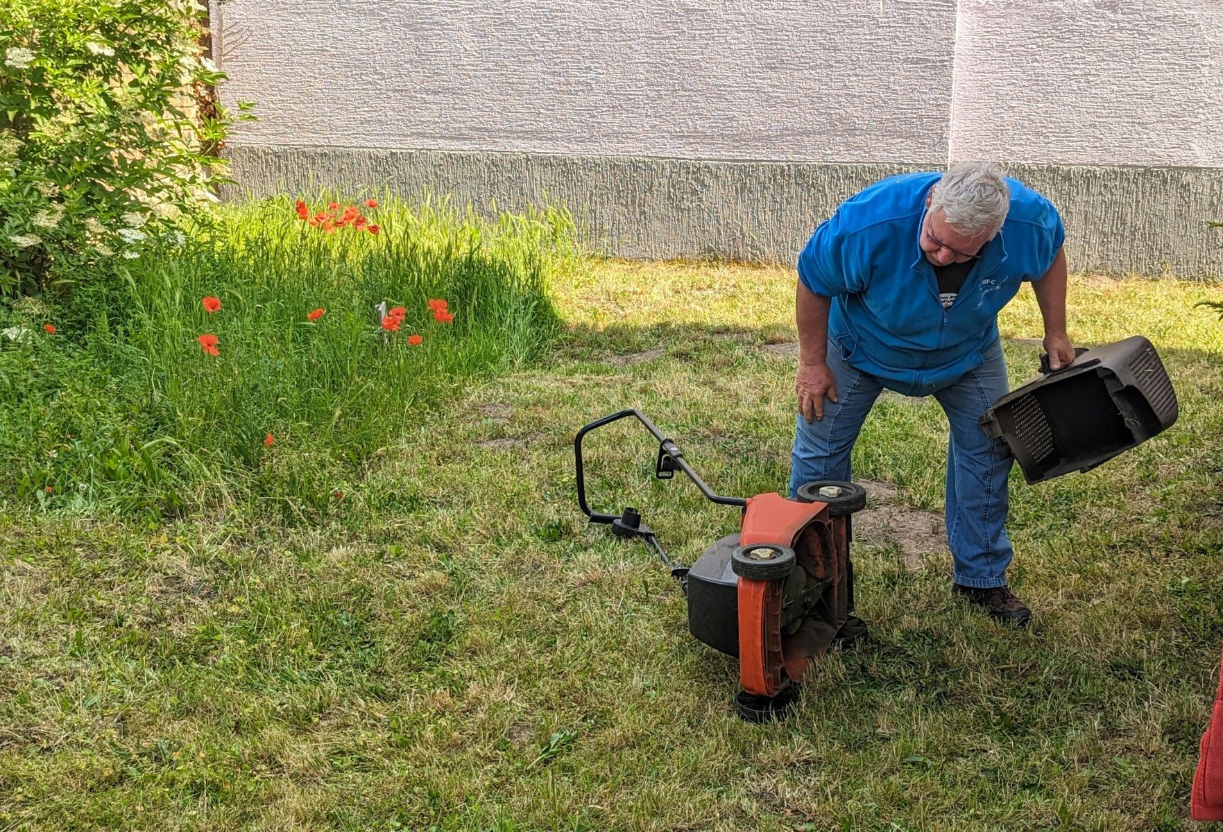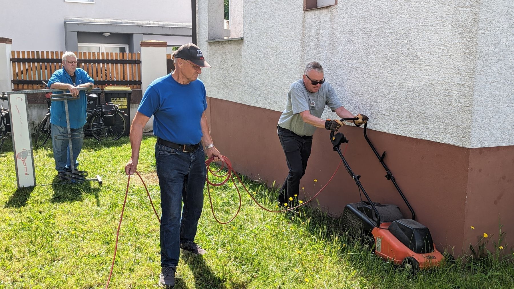 Die Mäharbeiten am Vereinsheim sind vollbracht. Jeder durfte mal das Kabel halten, insbesondere der Hermann 😊, sodass der Mäher es nicht aufisst. Wir haben ungefähr eine Stunde für das ganze Spektakel gebraucht. Und mit „wir“ sind der Hermann, der Jochen, der Jupp und ich (der Mike) gemeint. Wir wünschen euch noch eine schöne Zeit und frohes Mähen!