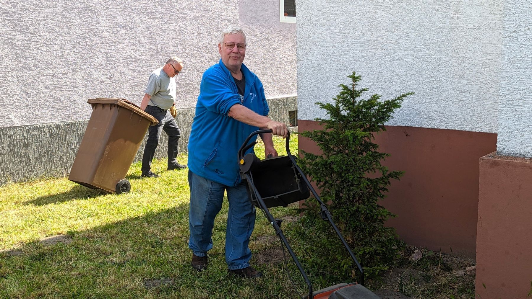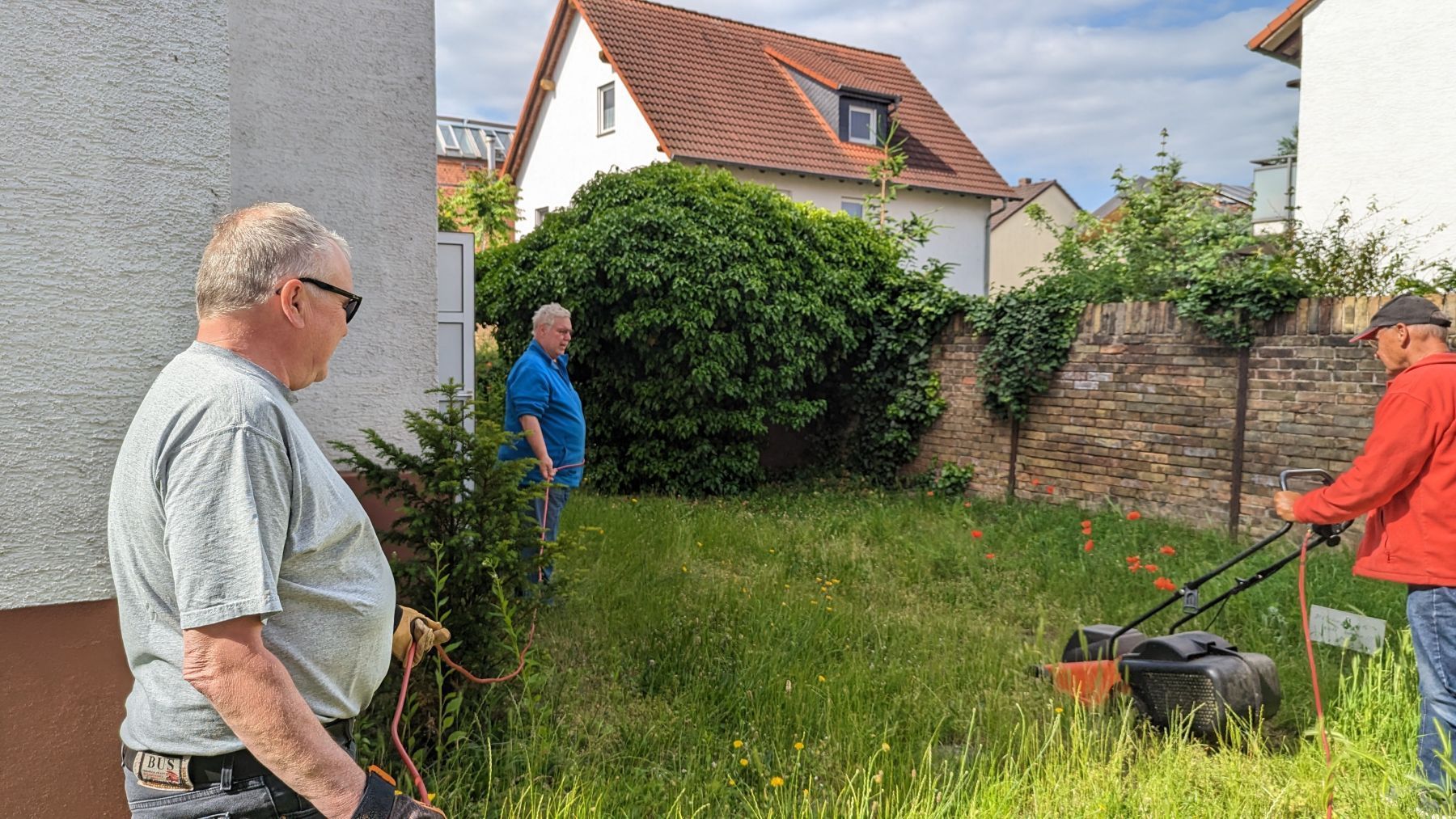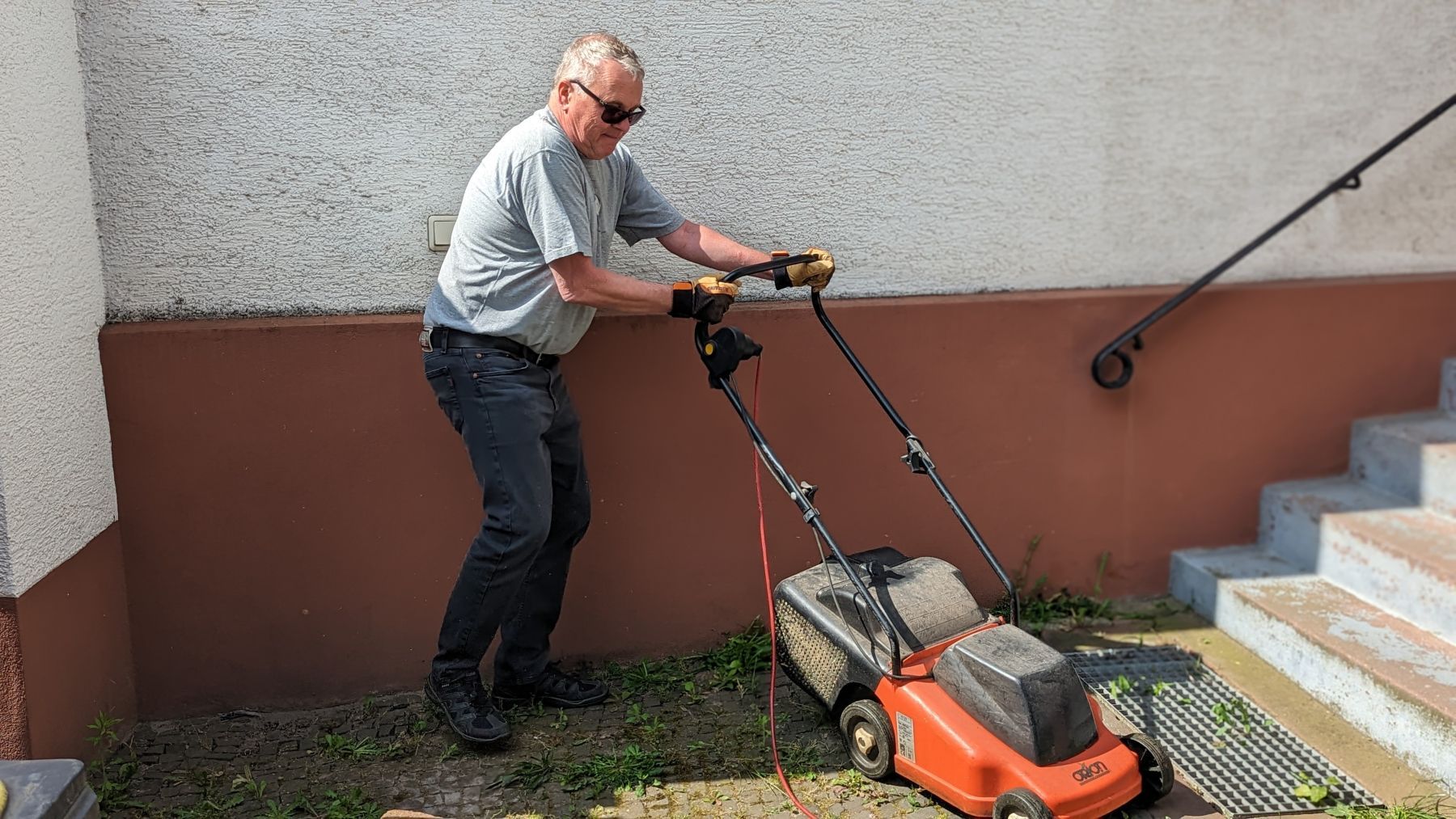 Die Mäharbeiten am Vereinsheim sind vollbracht. Jeder durfte mal das Kabel halten, insbesondere der Hermann 😊, sodass der Mäher es nicht aufisst. Wir haben ungefähr eine Stunde für das ganze Spektakel gebraucht. Und mit „wir“ sind der Hermann, der Jochen, der Jupp und ich (der Mike) gemeint. Wir wünschen euch noch eine schöne Zeit und frohes Mähen!